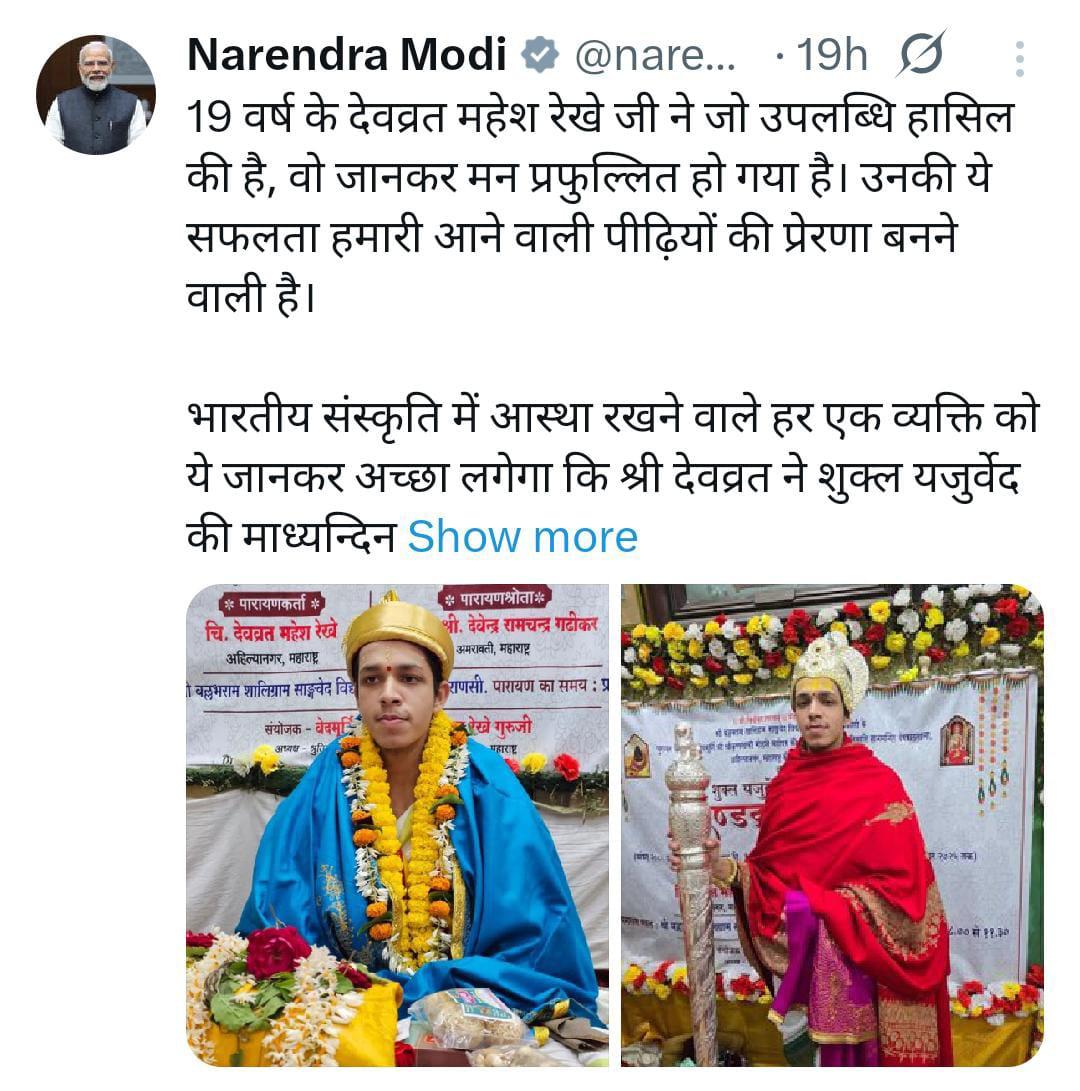 “देवव्रत जैसा युवा जब वेदों की ओर लौटता है, तो यह संपूर्ण भारत की सांस्कृतिक शक्ति को दर्शाता है. उनकी साधना और अनुशासन आने वाली पीढ़ियों को प्रेरित करेगा.” मोदी ने इसे भारतीय ज्ञान-परंपरा की पुनर्स्थापना का ऐतिहासिक क्षण बताया.